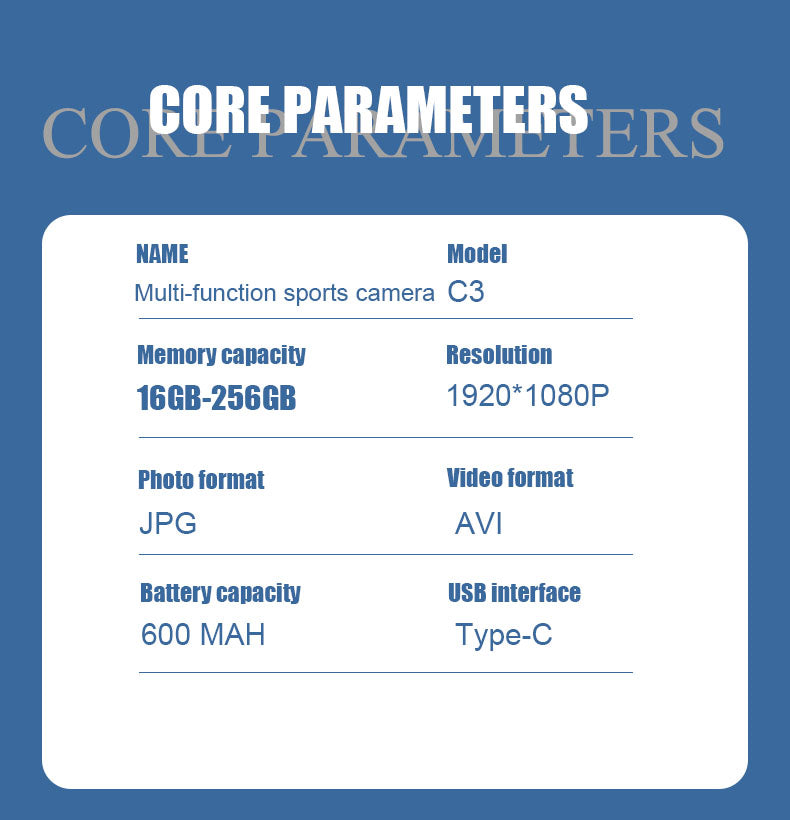 This mini body waterproof action camera is equipped with 256GB of storage space and supports high-definition 1080p wide-angle shooting, ensuring rich details in dynamic images. The built-in 10x CMOS sensor enhances image quality, and the Wi-Fi streaming media transmission function facilitates real-time sharing and remote control. The lightweight design is suitable for wearing and use, and the water-resistant shell ensures a stable and reliable shooting experience during outdoor activities. It is a professional choice for sports recording.